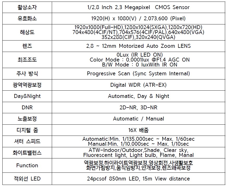 · 1/2.8" 2.3MP CMOS Image Sensor · 최대 2메가 픽셀 1920x1080p 해상도 지원 · 2.8~12mm (3Mega) AutoZoom LENS 지원 · 고화질을 위한 혁신적인 RGB 보정 · WDR 광역역광보정 (D-WDR) · 트리플 스트리밍 지원 (H.264/MJPEG) · 디지털 노이즈 감소 지원 (2D/3D-NR) · 화면의 밝기 대비 차이를 보정 (AE) · 광각 Lens 사용시 중앙과 주변 밝기 차이 보정 · 안개 보정 기능 (D-FOG) · 실시간 결점 보정 및 수동 보정 (매뉴얼:1024개) · 하이라이트 기능 (HLM) · 물체 움직임 감지기능 · 템버링/화면왜곡보정/영상회전기능 · OSD 지원 · 오디오·알람 입출력 기능 (옵션)